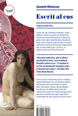 Louise: pèl-roja, de bellesa exuberant, casada, adúltera. Pel cos se li estén una malaltia que l’amant desconeix. L’obsessió fa que es lliurin als plaers d’una relació desenfrenada, amarada de desig i sexe, en què les pells es fonen l’una amb l’altra d’una manera que no havien experimentat mai. Fins que arriba la por i, de retruc, la distància, però no el final de l’atracció. Escrit al cos és un dels textos que va consagrar Jeanette Winterson com una de les escriptores més singulars del nostre temps. En aquest llibre, provocador i delicat, l’autora despulla les relacions i les allibera de la moral i les convencions socials per mostrar-nos que l’amor, sigui de la naturalesa que sigui, deixa traces inesborrables de vida i passió als nostres cossos.